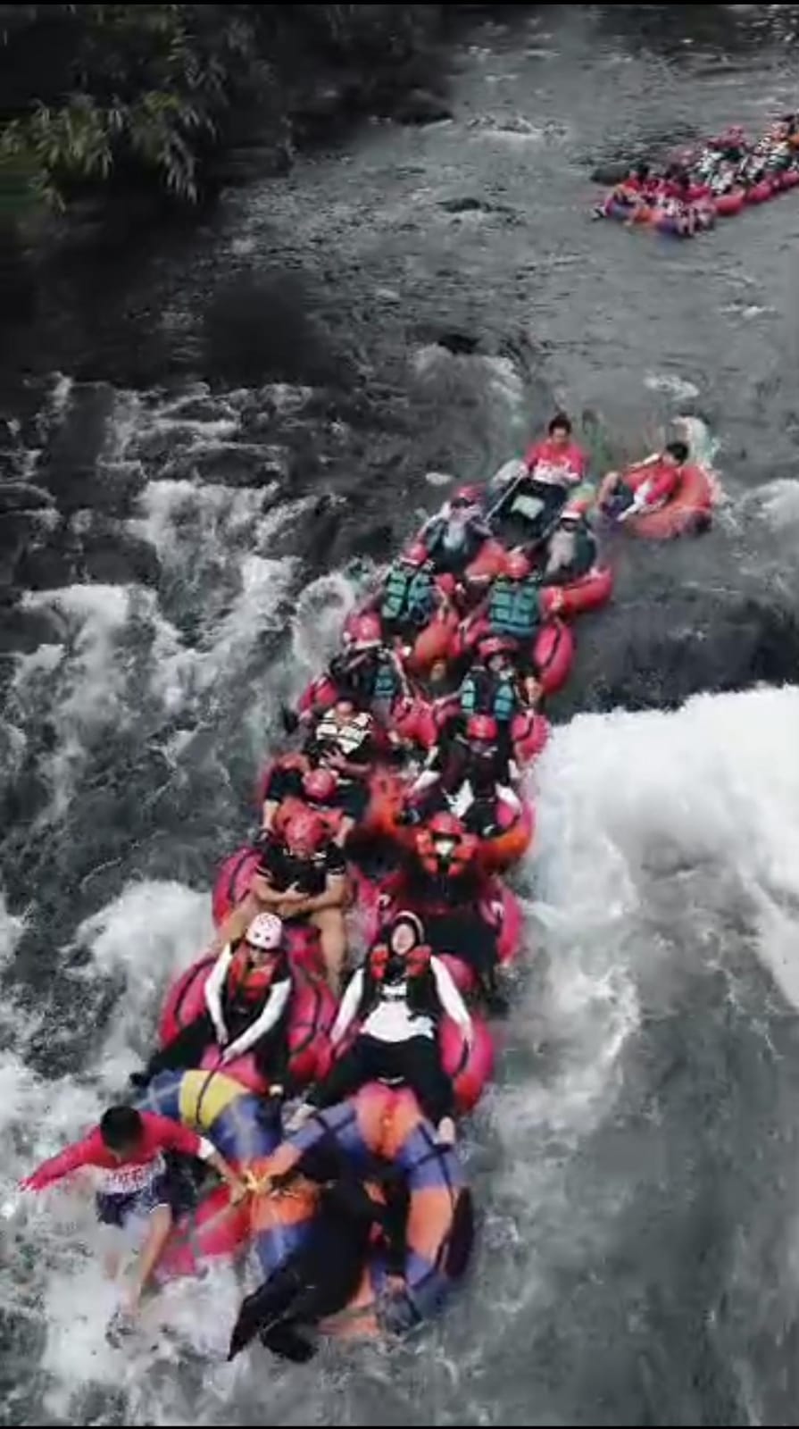 Dengan ban pelampung sederhana yang diduduki dan saling bersambung, mereka menyusuri arus sungai yang kadang tenang, kadang deras, bahkan sesekali beriak dan bergelombang. Suara gemercik air yang memantul ke batu-batu di tepi sungai terasa seperti lantunan musik alam yang menenangkan jiwa. Udara sejuk yang bersih dan segar, jauh dari hiruk pikuk serta polusi kota, membuat hati semakin damai dan lapang.